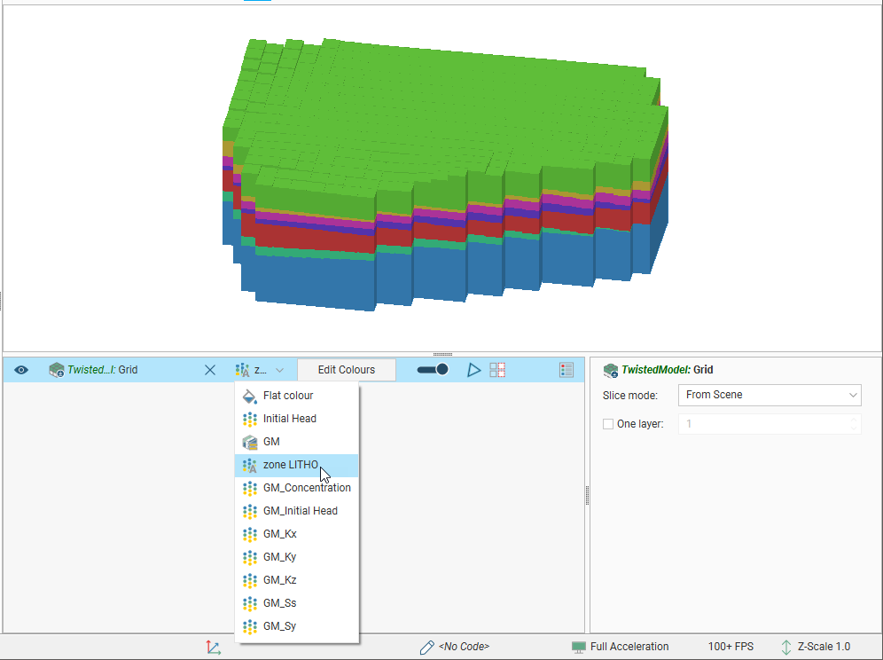 The viewing options available are the flat colour option, the evaluated geological model and zone data imported with the model. Other inputs imported with a model will also be available from this list, and once the model has been evaluated against a geological model or interpolant, you can also display the model using the grid’s hydrological properties.