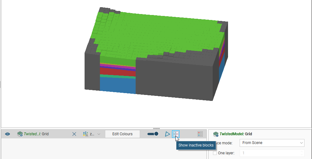Dragging a MODFLOW model into the scene displays its grid object. Here, an imported model has been evaluated against a geological model and added to the scene: