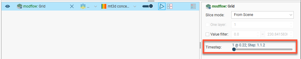 The information will be added to the MODFLOW grid, and you can then select the head values and MT3D concentrations in the shape list when you display the grid in the scene. If the output is time-dependent, a timestep slider will be available from the shape properties panel. Click and drag the slider or click along the timeline to view the different timesteps available: