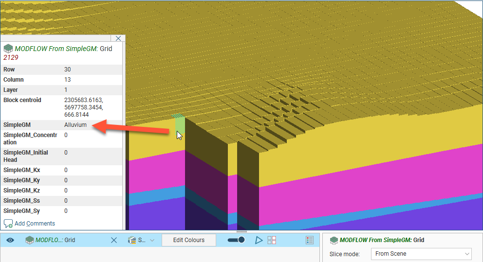 When a MODFLOW model is displayed in the scene, you can view information about the individual cells in the model by clicking on a block. The window that appears shows information about the selected block, including its centroid and the lithology assigned to the block from the evaluated geological model. Information from all geological models and interpolants the grid has been evaluated against will be displayed:
