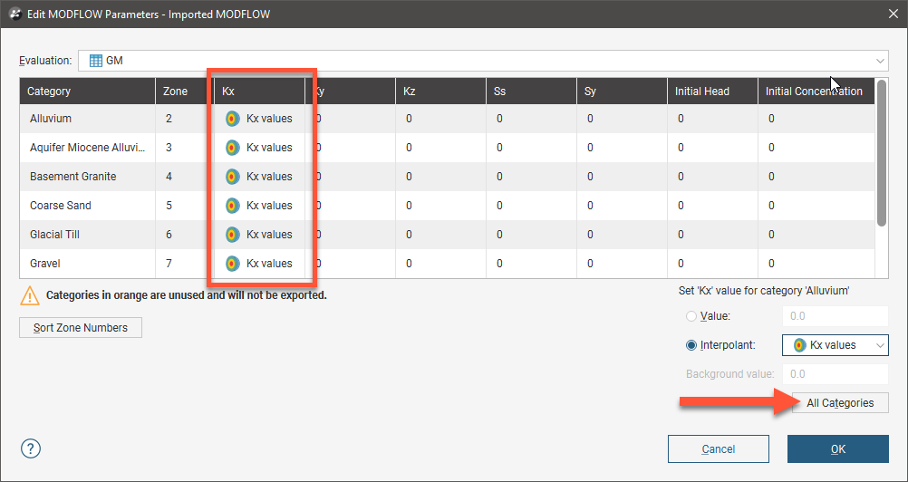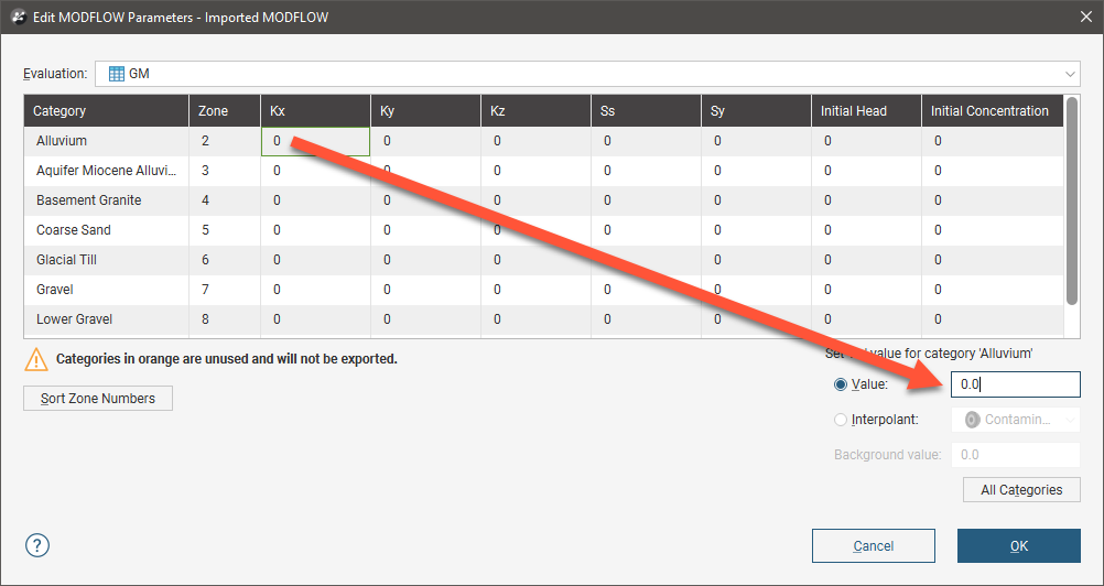 In the Edit MODFLOW Parameters window, you can enter the values for hydrological properties manually or you can use the values from an interpolant.