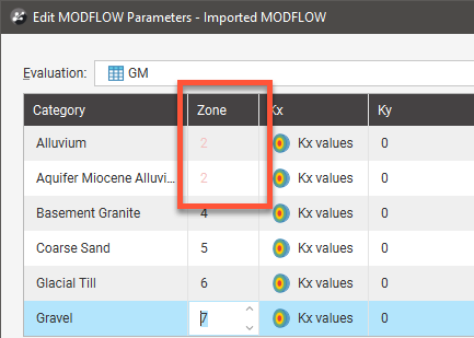 When the model is exported, the zone numbers are used to indicate the assignment of lithologies to blocks and are written to the MODFLOW zoned layer properties flow (*.lpf) file. In the Edit MODFLOW Parameters window, you can change the zone number for a lithology by clicking in a cell and entering a different zone number. If you reorder the zones in this way, zone number conflicts will be highlighted in red: