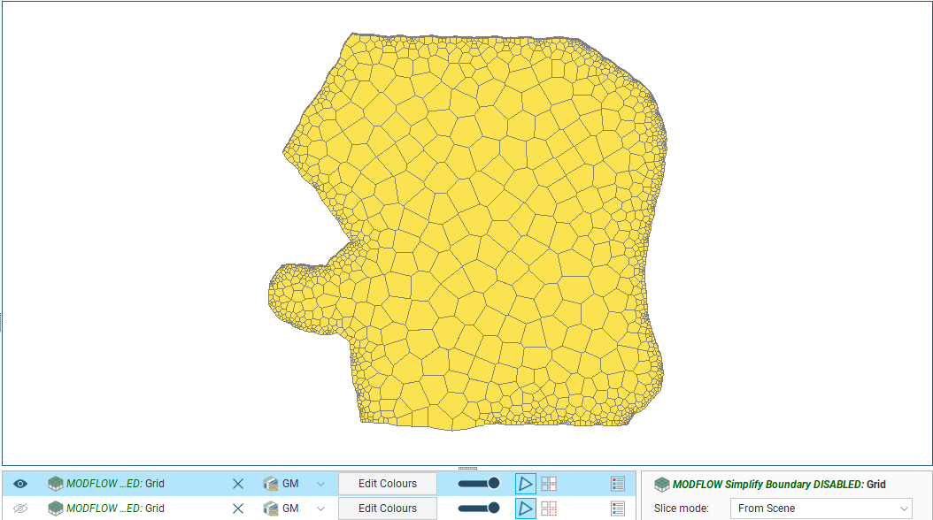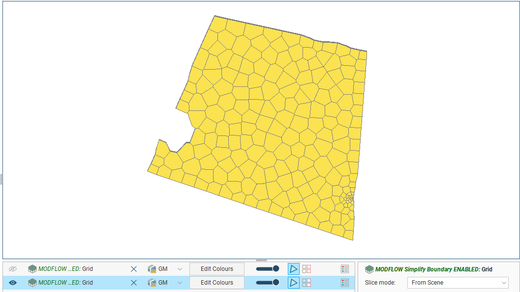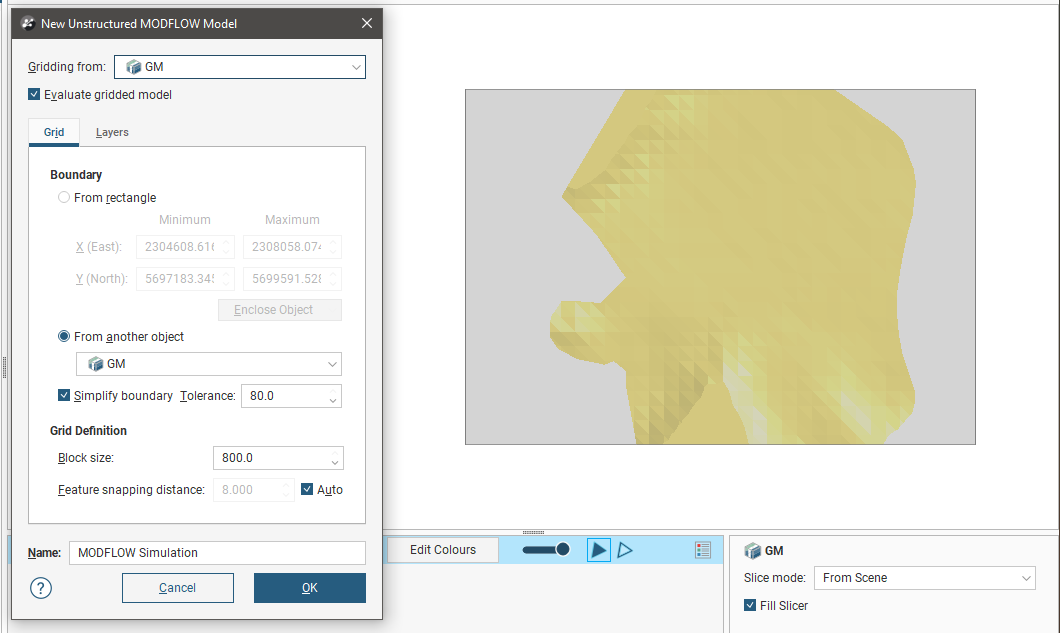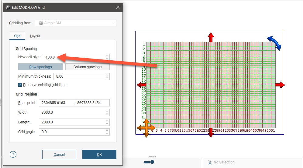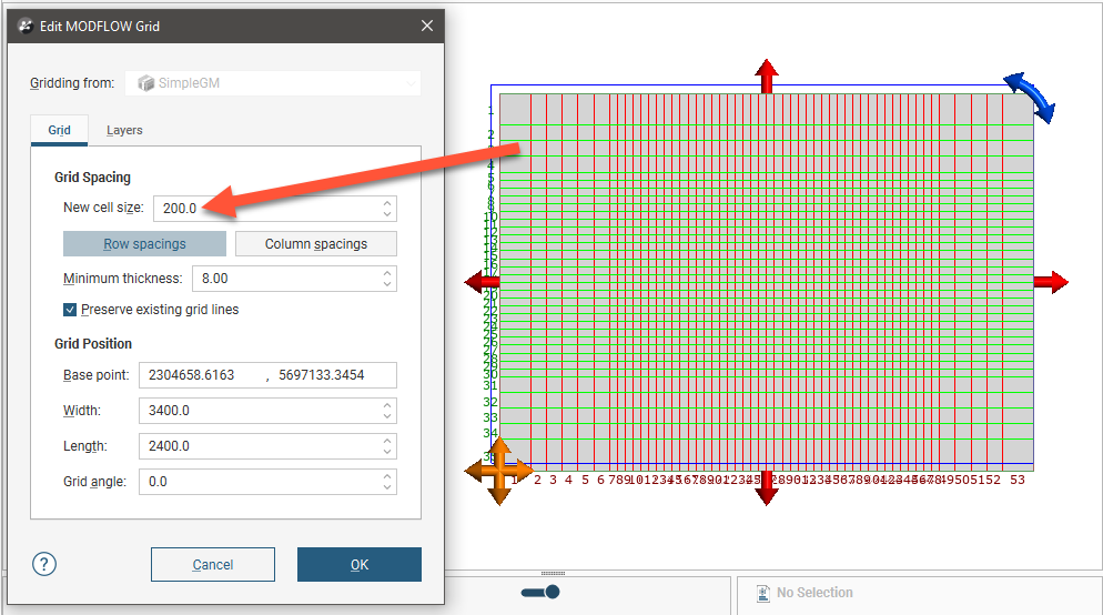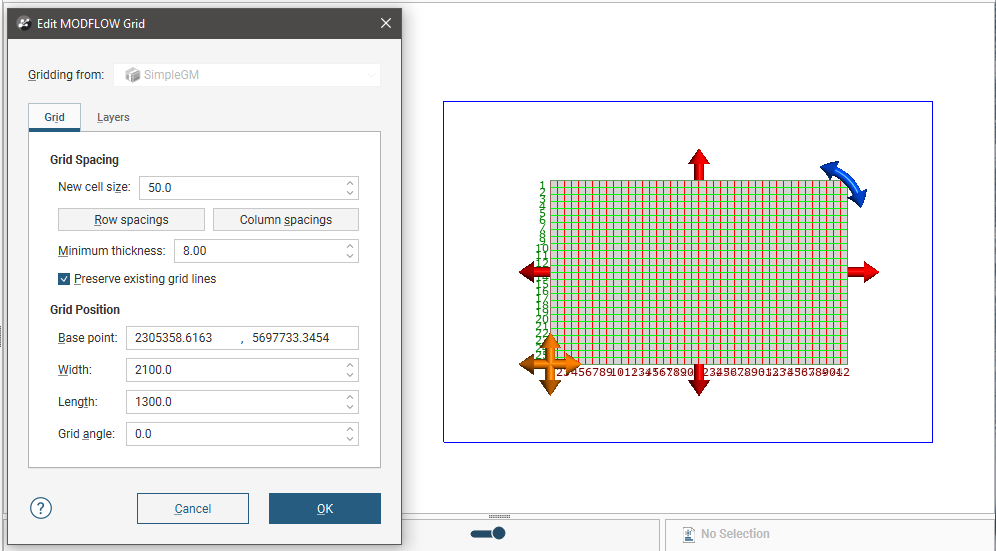 The grid should be slightly smaller than the selected geological model. Any MODFLOW cells that exist outside the geological model will be marked as inactive when the grid is exported to MODFLOW .