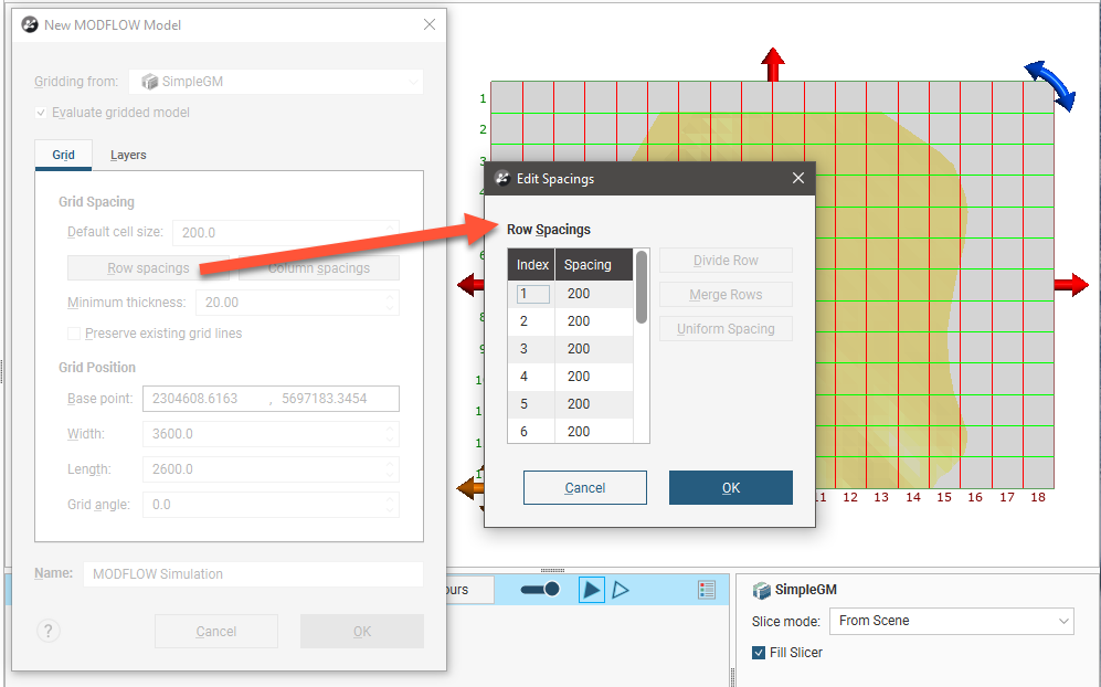 ). The Edit MODFLOW Grid window will appear. You can edit the grid spacings, using the information in the scene window as a guide.