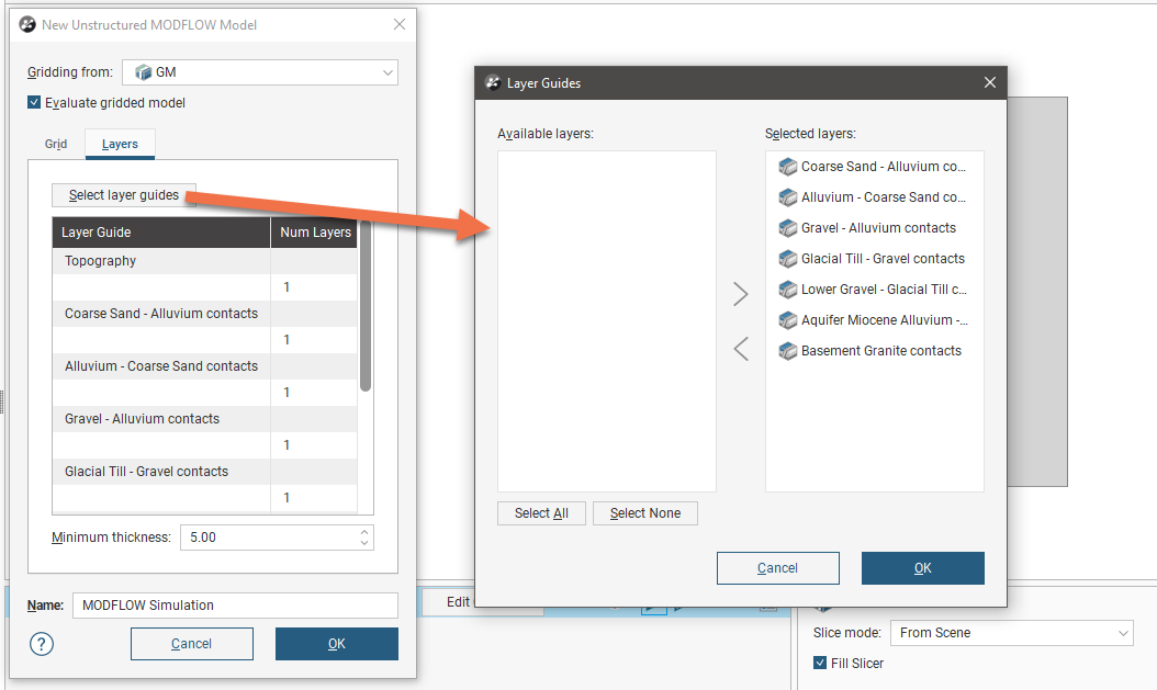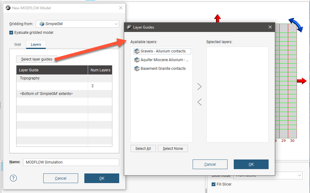Click on the Layers tab to see the layers that will be used in the new model. By default, the layers from the Gridding from model are selected as layer guides, but you can change this by clicking the Select layer guides button and changing which layers are used: