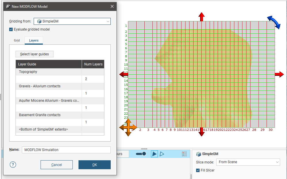 The new MODFLOW model will be based on the geological model in the Gridding from setting. If you wish to use a geological model other than the one selected when the window is opened, select it from the list. The grid dimensions will be updated in the scene.