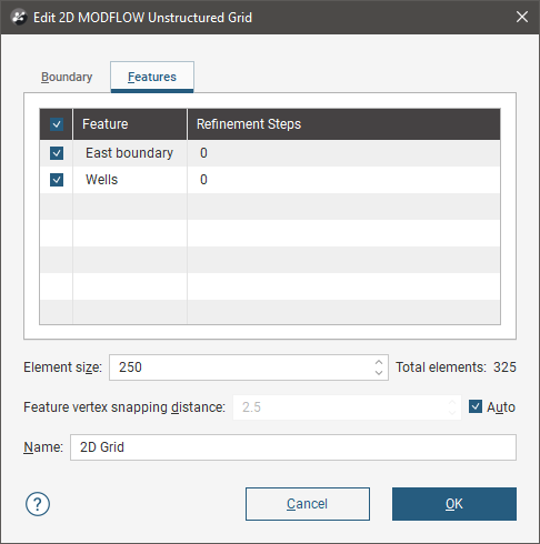 For this example, we will start with a new grid with a New cell size of 50. We will set the adjacent cell size to 100 and the cell size at the outer boundary to 200.