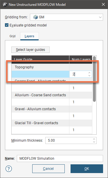 Click OK to return to the New MODFLOW Model window, in which the selected layers will be displayed: