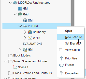 To add features to the model, expand it in the project tree, then right-click on the 2D grid object (