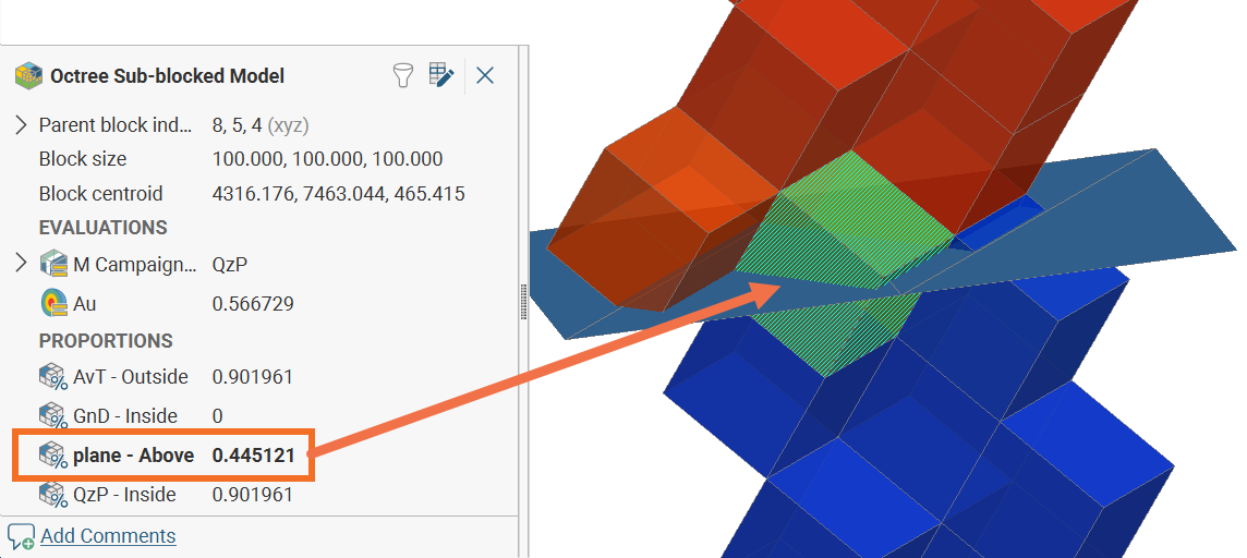 Each block will have a proportion calculated according to the ratio of each block relative to the Proportions of Block options for each surface. In the following example, a little less than half of the selected block is above the mesh called ‘plane’, and the exact proportion has been calculated as 0.445121. The same block has a proportion of 0.901961, or just over 90%, inside a mesh called ‘QzP’ (not shown).