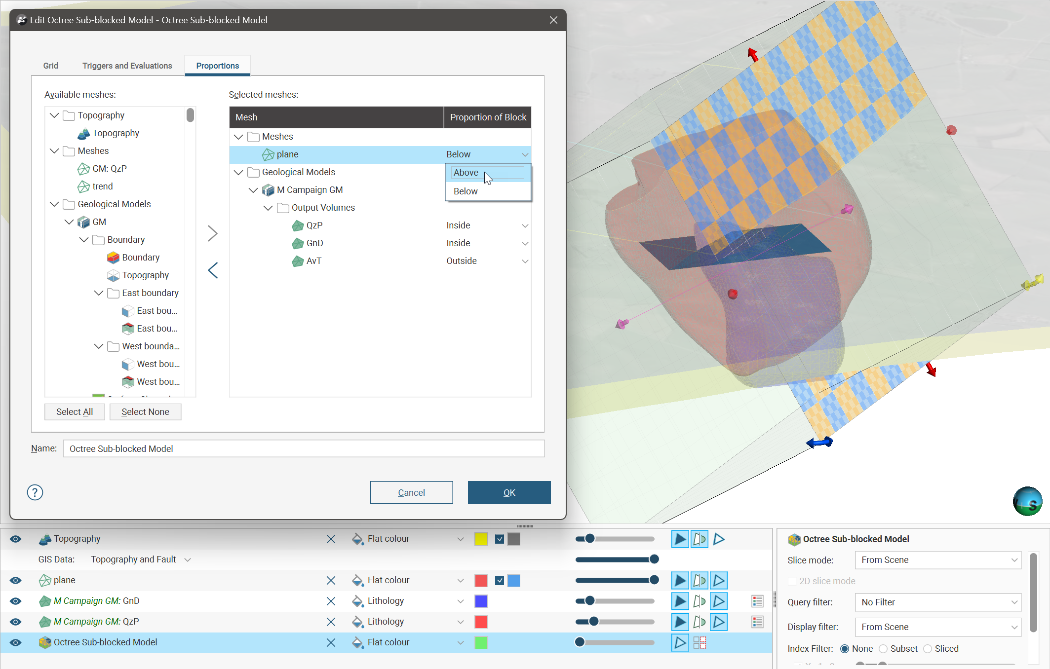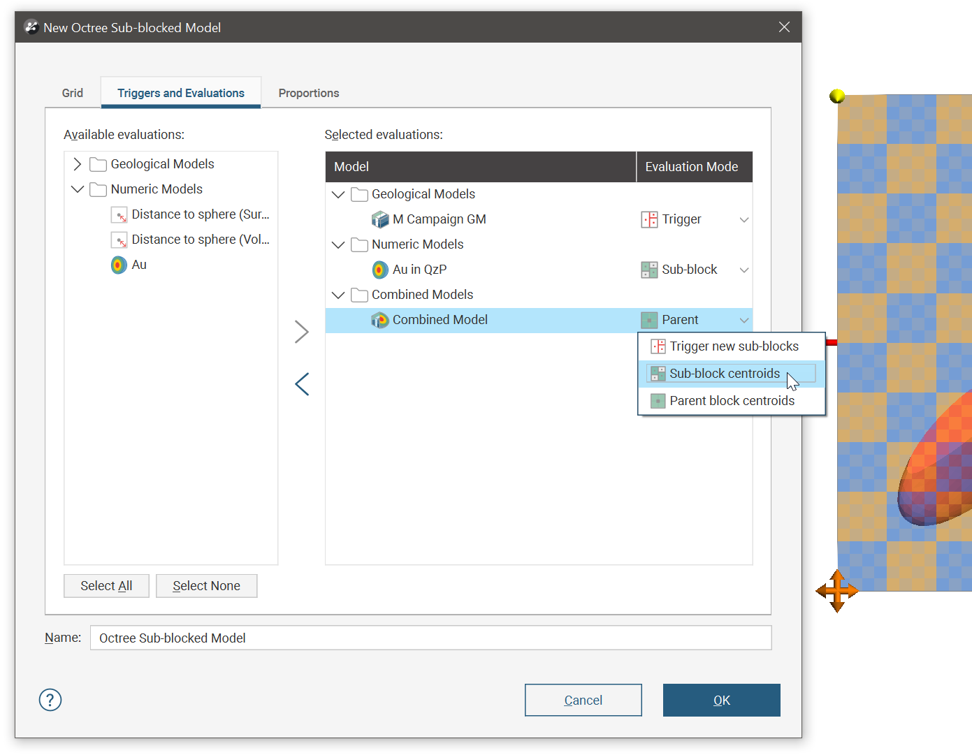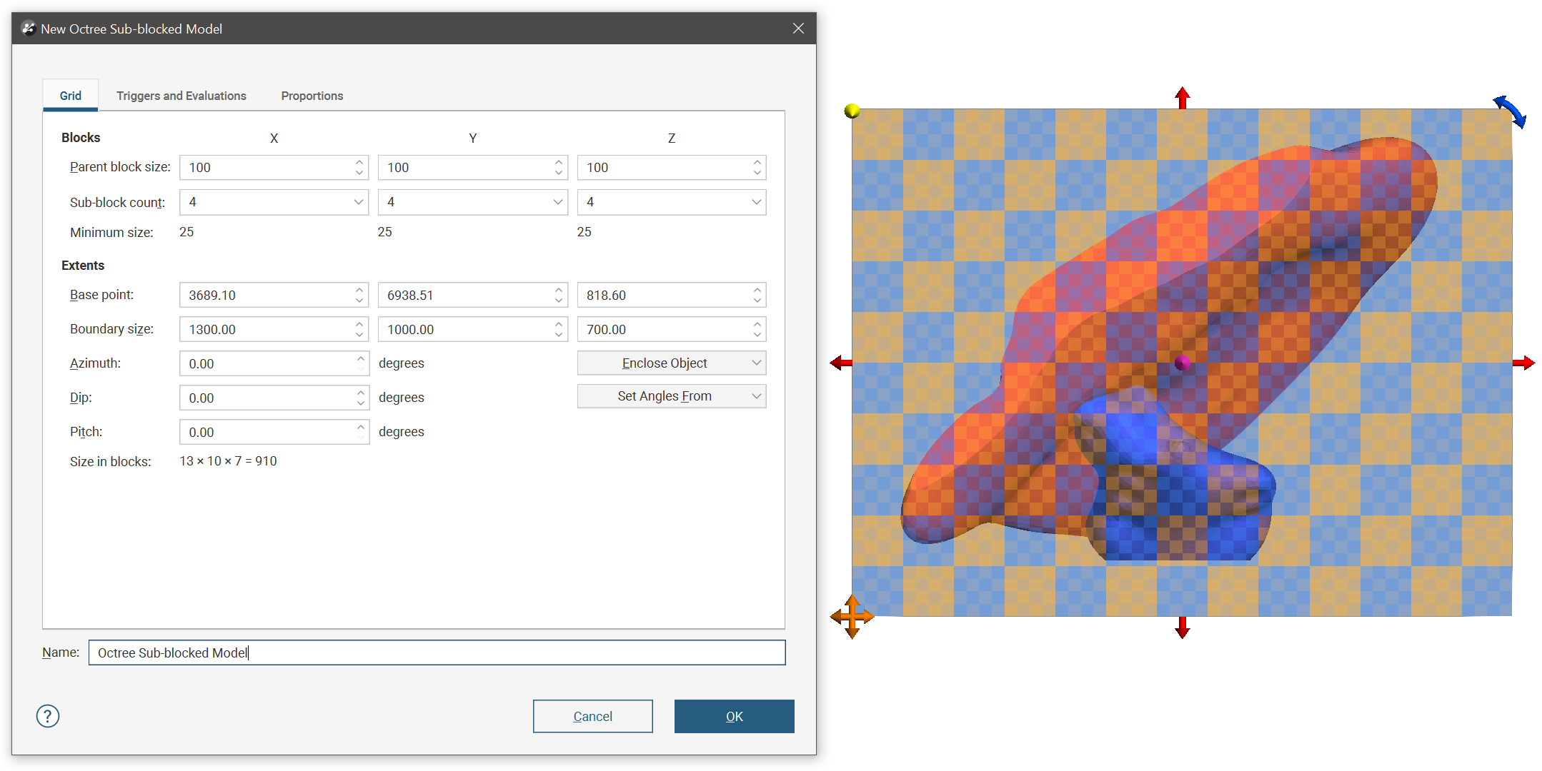 Once you have set triggers, evaluations and proportions, enter a Name for the octree block model and click OK. The model will appear under the Block Models folder. You can make changes to it by double-clicking on it.