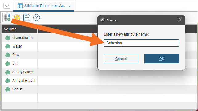 For geological models, numeric models and combined models, you can assign attributes to the model volumes. To do this, right-click on the model in the project tree and select Volume Attributes. In the window that appears, click the Add Attribute button () to add a new column.