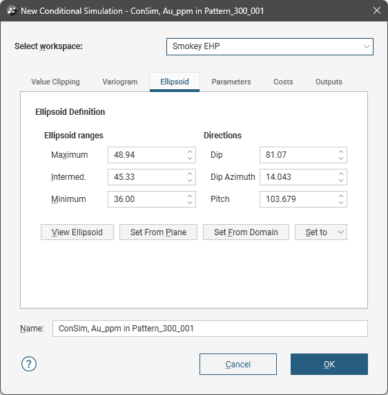 The Ellipsoid tab defines the primary anisotropic search volume size and orientation. Neighbourhood samples will be selected from within this search volume.