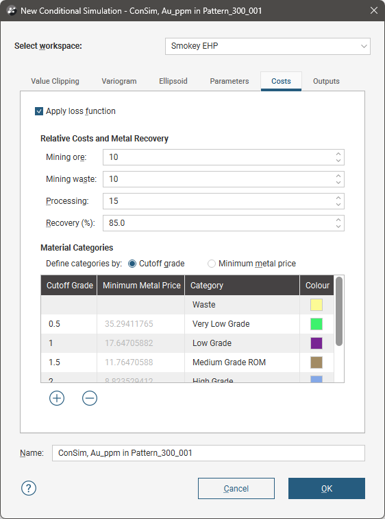 If it was enabled, you can also review the calculated loss function value categories for optimum material classification based on the grade uncertainty: