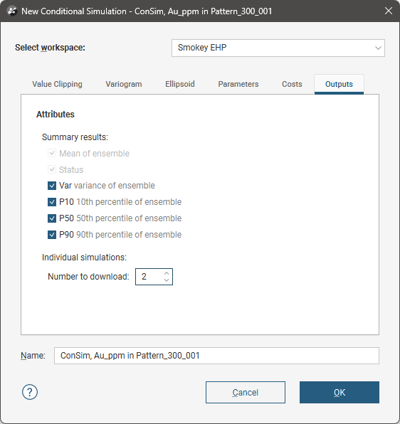 Conditional simulation will always produce the Mean of ensemble and Status results per block; simulated blocks will have a Status of Normal. You can also generate additional results, although these are optional: