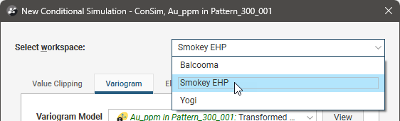 In the Variogram tab, select the transformed variogram model and the declustering object to use in the conditional simulation.