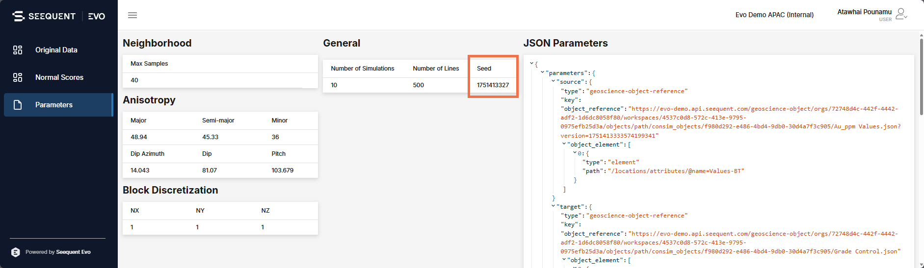 Select Parameters in the sidebar to see a report of the parameters used to generate the conditional simulation, including the JSON parameters used by the Seequent Evo simulation service. One particularly useful detail in the report is the identification of the Seed used. See Parameters above to see how this number can be used in the Random seed input parameter field to get repeatability in results.