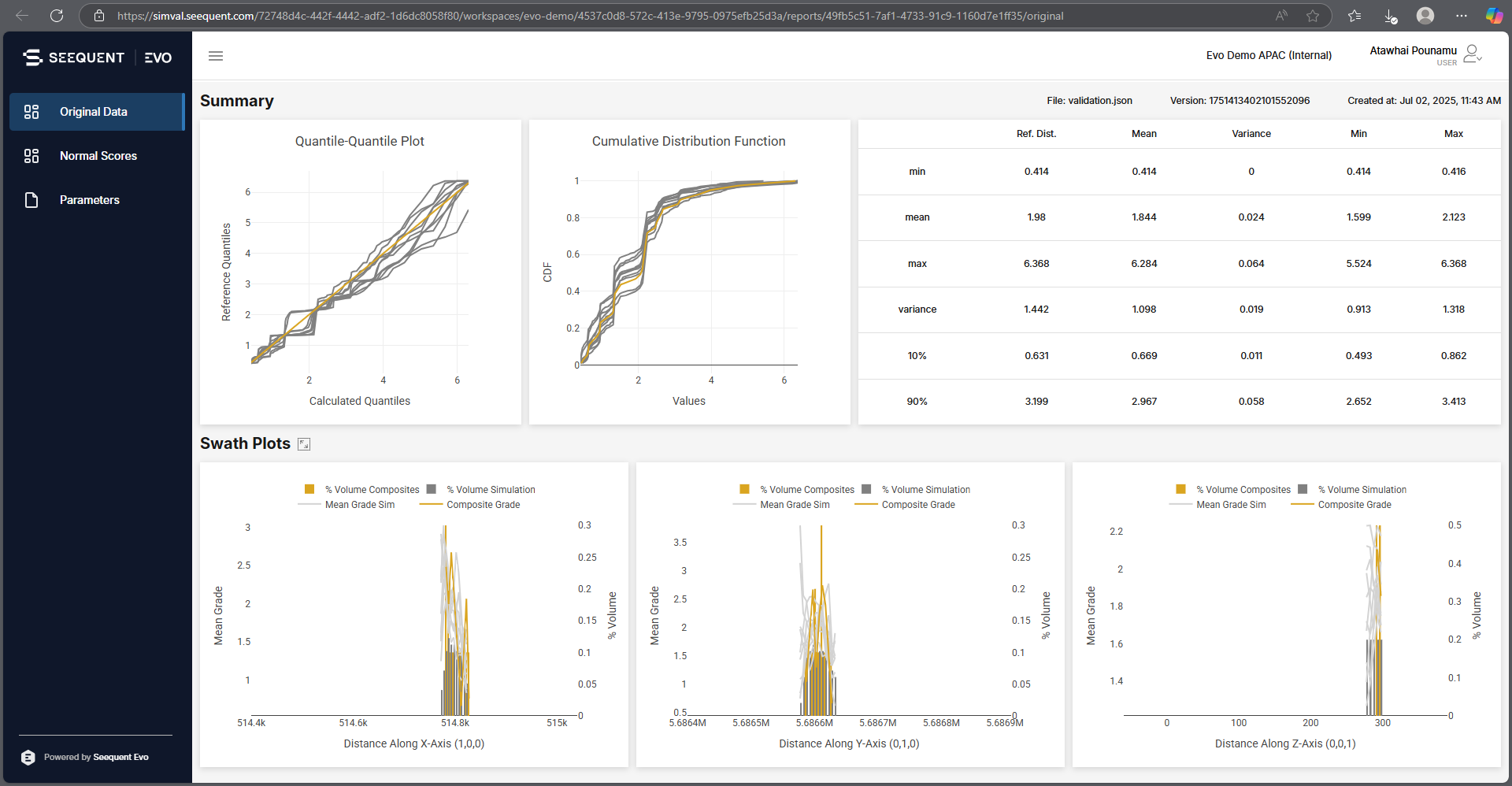 Validation reports generated from a conditional simulation will be added to the block model in the project tree under the heading Consim Reports. Right-click on a report and select Open in Seequent Evo to open it in your browser: