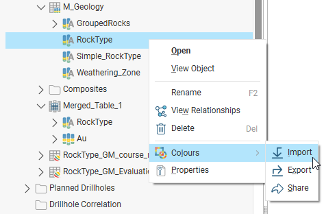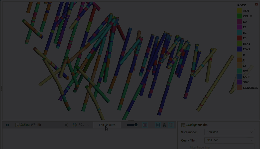 Category data such as lithologies is displayed according to a colourmap of the categories in the table. Category colourmaps can be reused in other objects and can easily be shared between projects on a column-by-column basis, which is useful if your organisation uses standard category colourmaps.