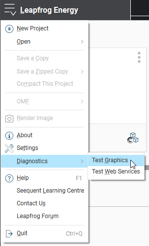 To start the test, open Leapfrog Energy and select Test Graphics from the Leapfrog Energy > Diagnostics menu: