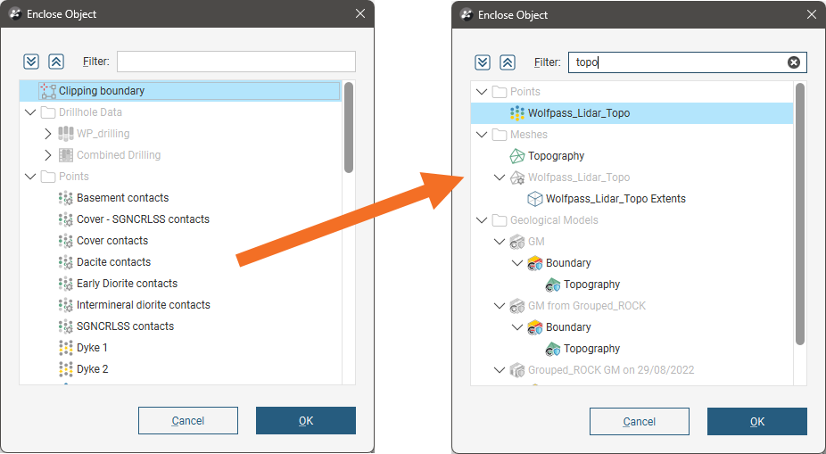 You can also search for objects in many Leapfrog Energy windows. For example, here the list of objects that could be used as the basis of a model’s extents is quite long. But filtering the suitable objects by name makes it easier to find the object you’re looking for:
