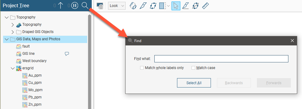 In the Find window, enter the information you are searching for, then click Backwards or Forwards to locate the object in the project tree.