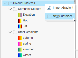 In many project tree folders, you can create subfolders that help in organising large numbers of data objects. For example, here colour gradients have been organised into subfolders: