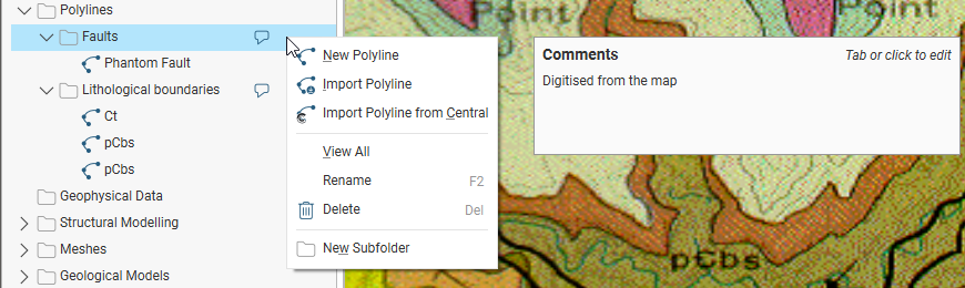 Subfolders have the same right-click commands as their parent folder, which means you can import or create new data objects inside the subfolder rather than in the parent folder. You can also add comments to folders to aid in keeping data organised: