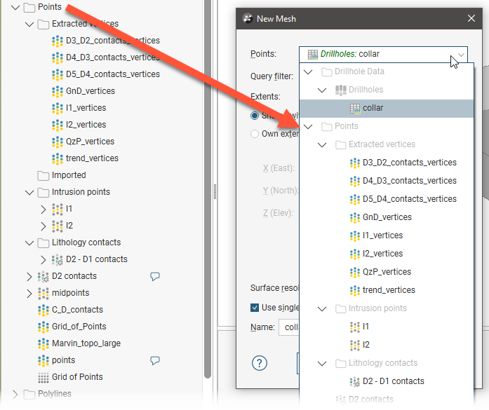 When lists of objects are displayed, the subfolder organisation will be reflected in the list. For example, when creating a mesh from points, the list of points objects that can be used to create a mesh is displayed organised by subfolder: