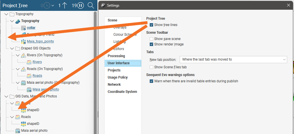 If you wish to display lines in the project tree, open the Settings window from the Leapfrog Energy menu. Click on User Interface and enable Show Tree Lines.