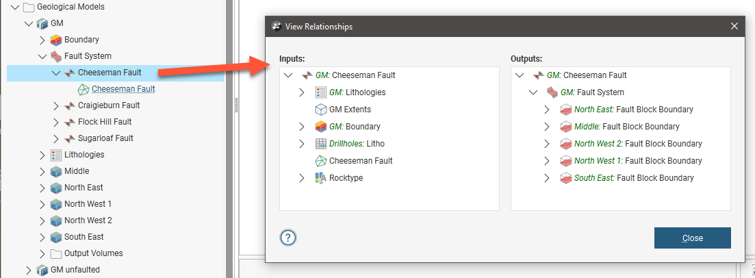 Here, viewing relationships for a fault in a geological model shows us not just the mesh that the fault was created from, but the different parts of the geological model that have been used in building the fault. In the Outputs part of the window, we can see that the fault has been used as an input to the fault system and so also affects the different fault blocks in the model.
