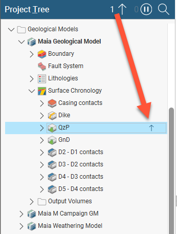 When changes are made to the prioritised object, the only objects processed will be those needed to make the prioritised object valid. For example, here the QzP surface has been prioritised. The geological model itself, its surface chronology and its output volumes will not be updated when the prioritised surface is updated: