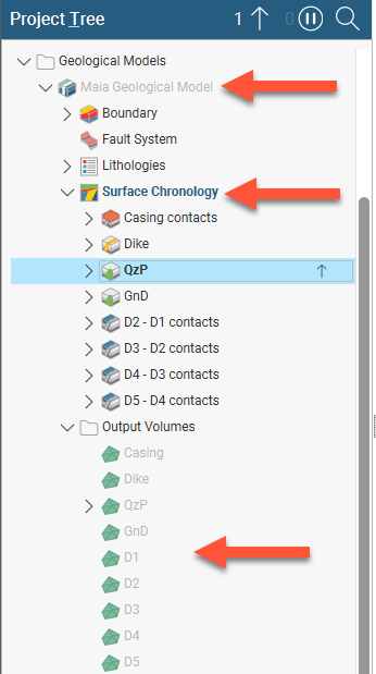 The Surface Chronology is currently being processed and so is shown in blue. The objects in the Output Volumes folder and the geological model itself are shown in grey: