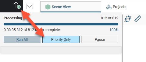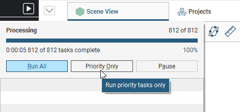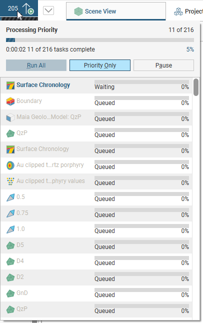 To limit processing of other objects further, you can set the processing queue so that only prioritised objects are processed. If your project has a lot of objects that are dependent on the object you are working on, this is useful for limiting the amount of time Leapfrog Energy dedicates to processing. To restrict processing in this way, click the processing button, then click Priority Only: