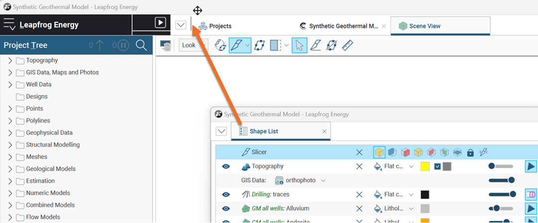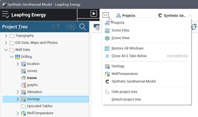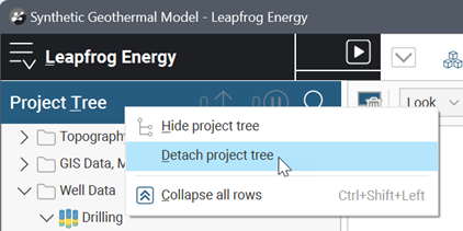 You can split the Leapfrog Energy main window into separate parts to make better use of your screen space. In addition, some Leapfrog Energy windows open in separate tabs that can be used either docked or detached. This topic describes how to change the main window to make the best use of your screen space. It is divided into: