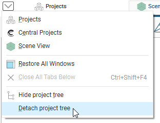 To reattach the project tree, click the X to close the tab. It will reappear docked to the main window. You can also click on the List open tabs button and select Attach project tree.