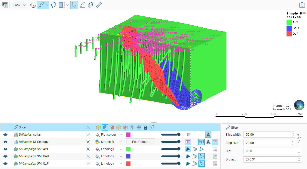 By changing the Slice mode for objects in the scene, you can illustrate how a model has been constructed. For example, here the AvT volume is displayed sliced, but the other volumes are unsliced, as is the drilling data, and we can see the relationship between the drilling data and the two intrusion surfaces modelled from it: