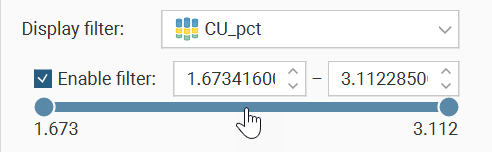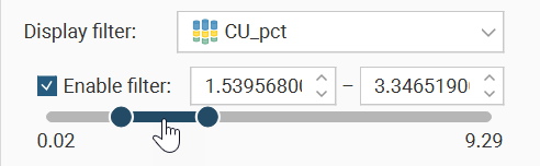If the column you select for the Display filter is a numeric column, a range slider will be displayed for selecting the values to filter: