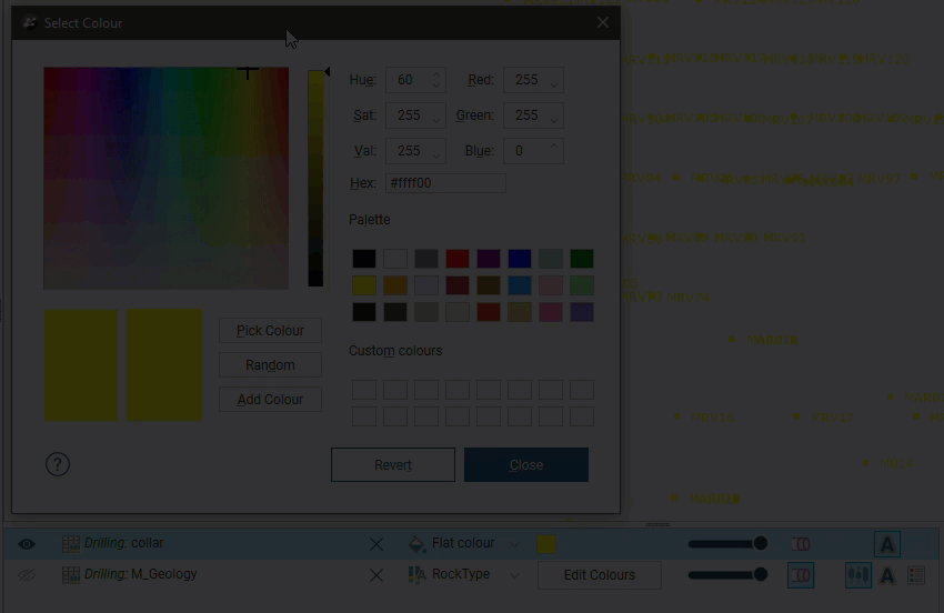 Many objects have a display colour list, which determines what data is used to display the object. For example, a lithology data table may contain several columns and the column displayed can be selected from the view list: