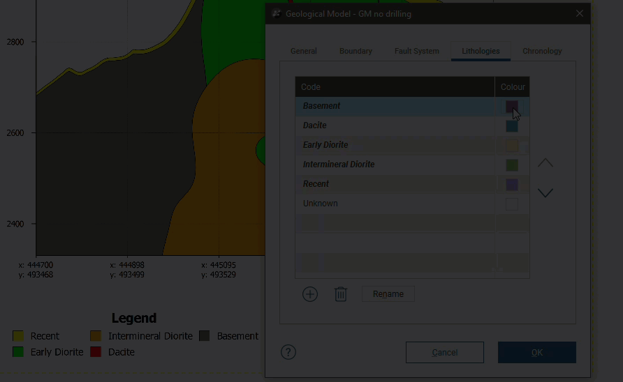 - The Geology table is displayed according to a colourmap of the categories in the table. These colours can be changed by clicking on the Edit Colours button, then clicking on each colour chip in the Legend window. For more information see the Category Colourmaps topic.