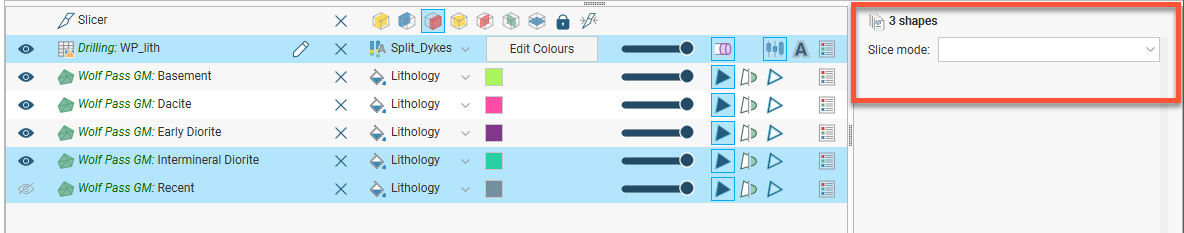 When the slicer is in the scene, how an object is sliced depends on its Slice mode, which is set in the properties panel. Being able to set Slice mode for each object gives you more flexibility in how you display data in the scene. See the Slicing Through Data in the Scene topic for more information.