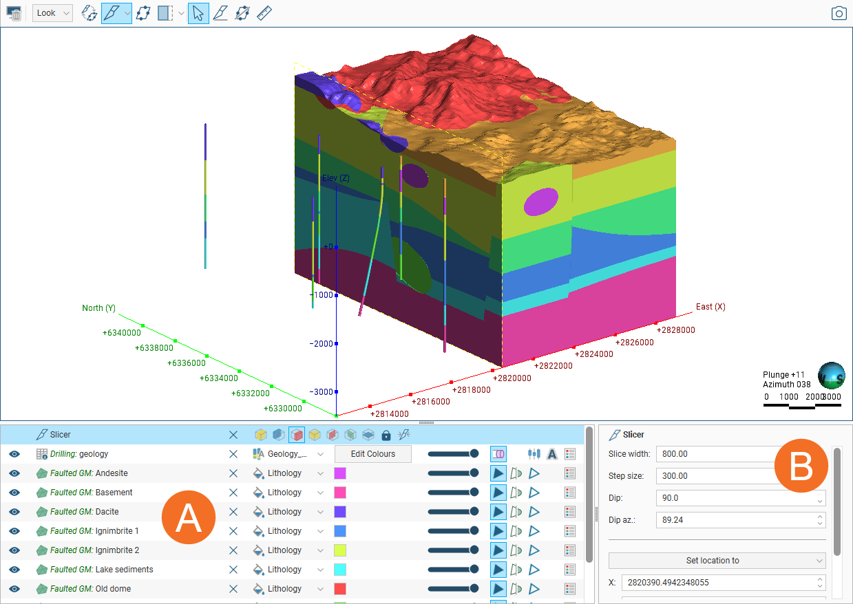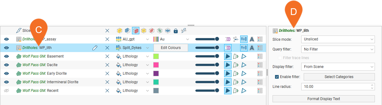 Visualising data is an important part of interpreting and refining data and making modelling decisions. In Leapfrog Energy, the appearance of objects in the 3D scene is controlled using the shape list and properties panel. Changing how you view objects in the 3D scene does not change those objects in the project tree. You can, therefore, freely experiment with changing how data is displayed without modifying the data itself.