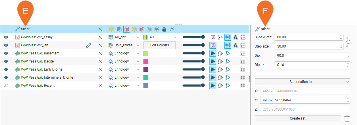 If, for example, the object clicked on is the slicer (E), finer controls for the slicer are displayed in the properties panel (F):