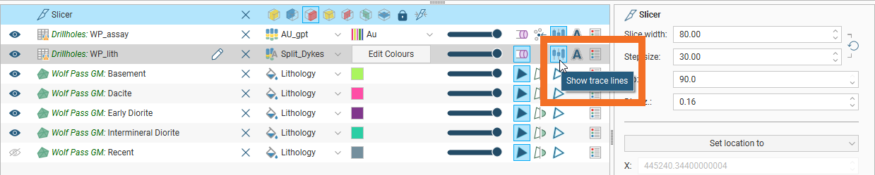 button displays the trace lines for a drilling data table: