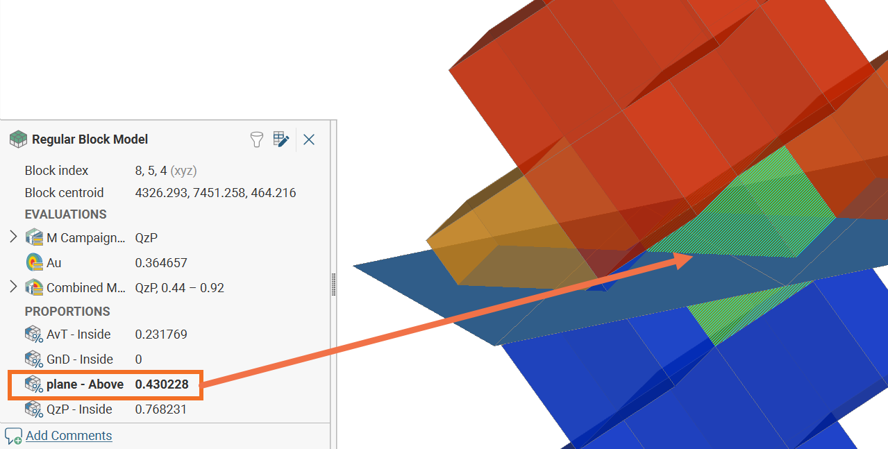 Each block will have a proportion calculated according to the ratio of each block relative to the Proportions of Block options for each surface. In the following example, a little less than half of the selected block is above the mesh called ‘plane’, and the exact proportion has been calculated as 0.430228. The same block has a proportion of 0.768231, or just under 77%, inside a mesh called ‘QzP’ (not shown).