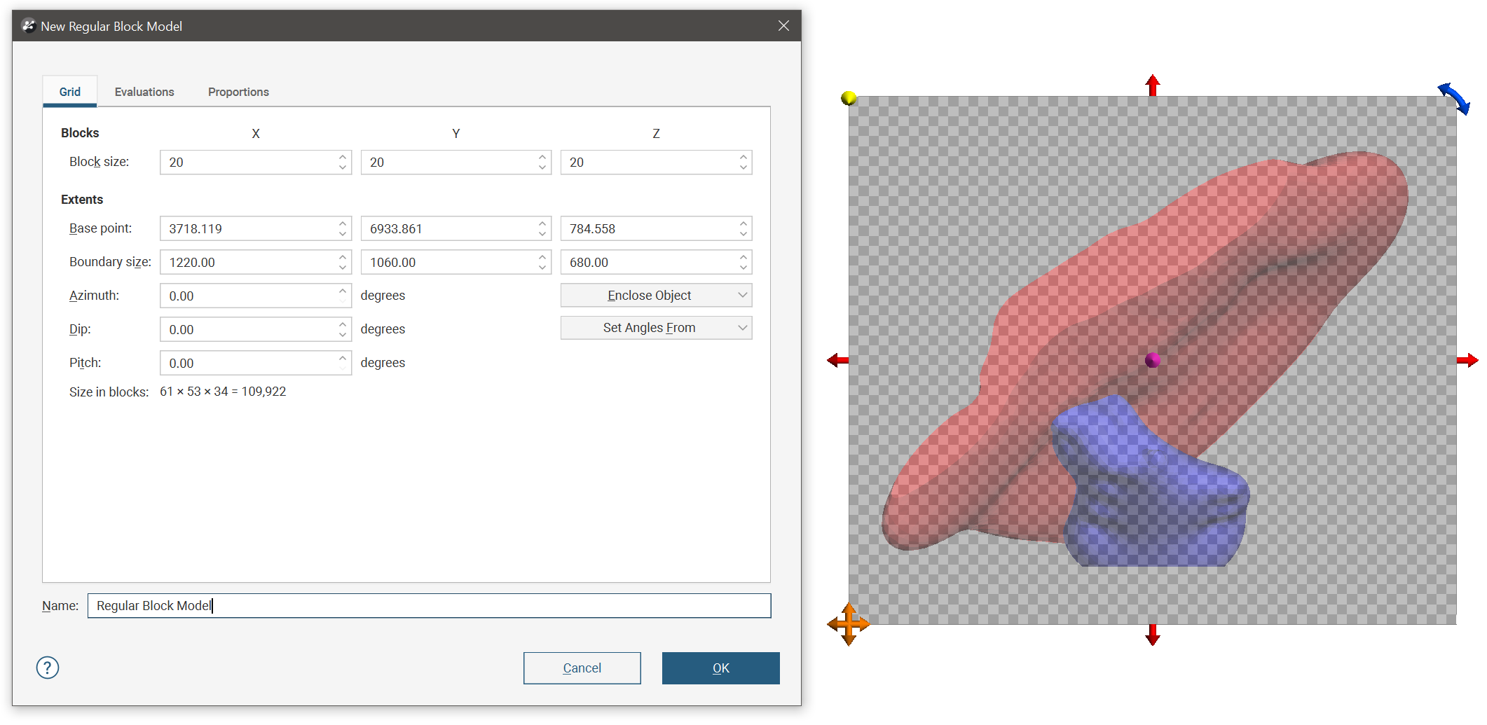 The New Regular Block Model window will appear, together with a set of controls that will help you set the size, location and orientation of the model in the scene: