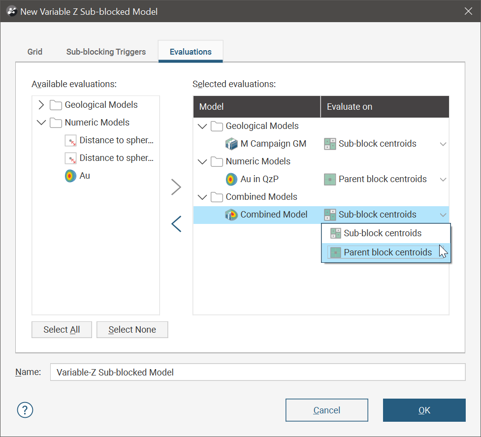 Variable z sub-blocked models can be evaluated against geological models, interpolants and distance functions in the project. To do this, click on the Evaluations tab. All objects available in the project will be displayed. Move the models you wish to use into the Selected evaluations list, then select whether to Evaluate on the Sub-block centroids or on the Parent block centroids.