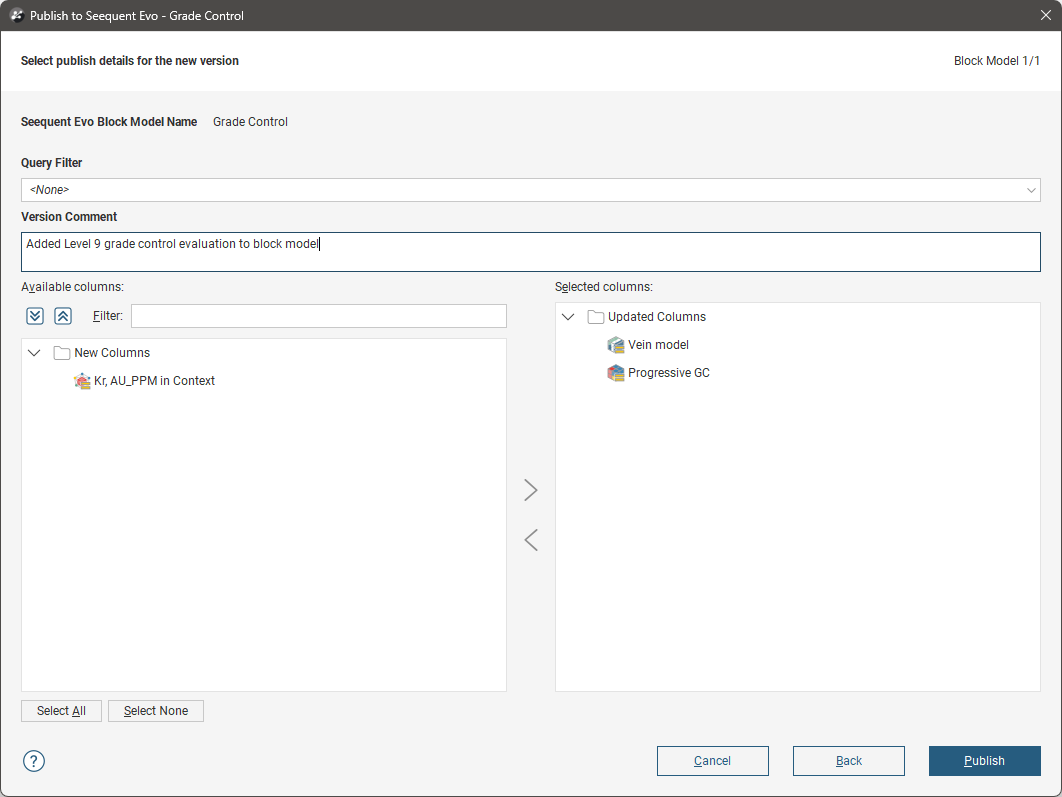 For regular block models, if you choose not to publish a column to Seequent Evo that already exists in the BlockSync block model, that data column will not be updated in Evo, but the column will remain. It will not be deleted from Seequent Evo simply because it was not selected for update when the revised model was published to Evo.
