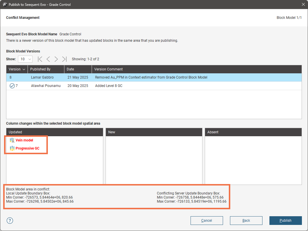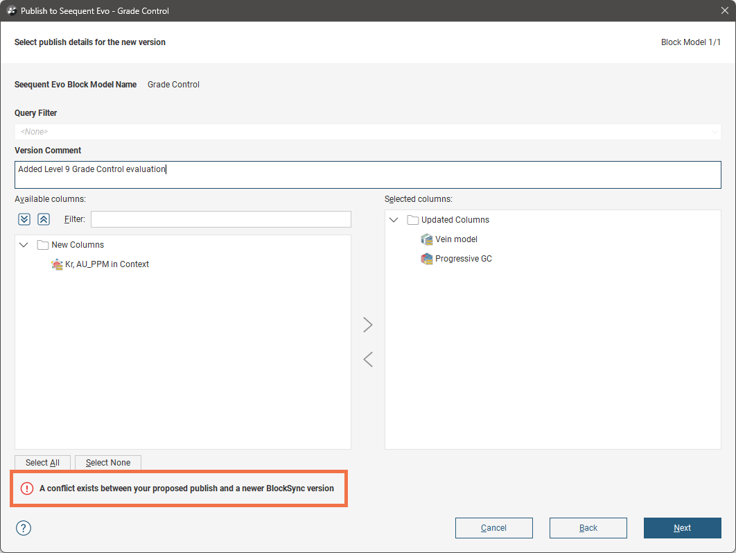 BlockSync version history supports a linear series of changes only. When multiple team members are working on a BlockSync model at the same time, it is possible that conflicting changes will result. When a team member publishes changes to a block model before you do, you will get the message A conflict exists between your proposed publish and a newer BlockSync version when you select Publish to Seequent Evo: