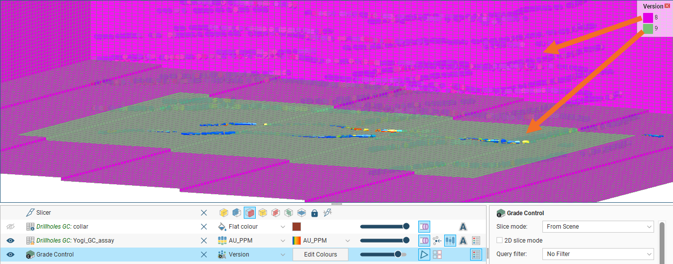 If you click Publish, you will not be prevented from making the changes; your changes will be applied to the block model and the previous version’s data will be over-written across the conflicted region. In the image below, Version 8 of a block model was published by another team member, then a constrained subset of the block model was published as Version 9; this conflicted with some of the Version 8 changes. The image shows the block model coloured according to version number, which identifies which parts of the block model relate to each publish event. The block model data in the Version 9 region has replaced the Version 8 data.